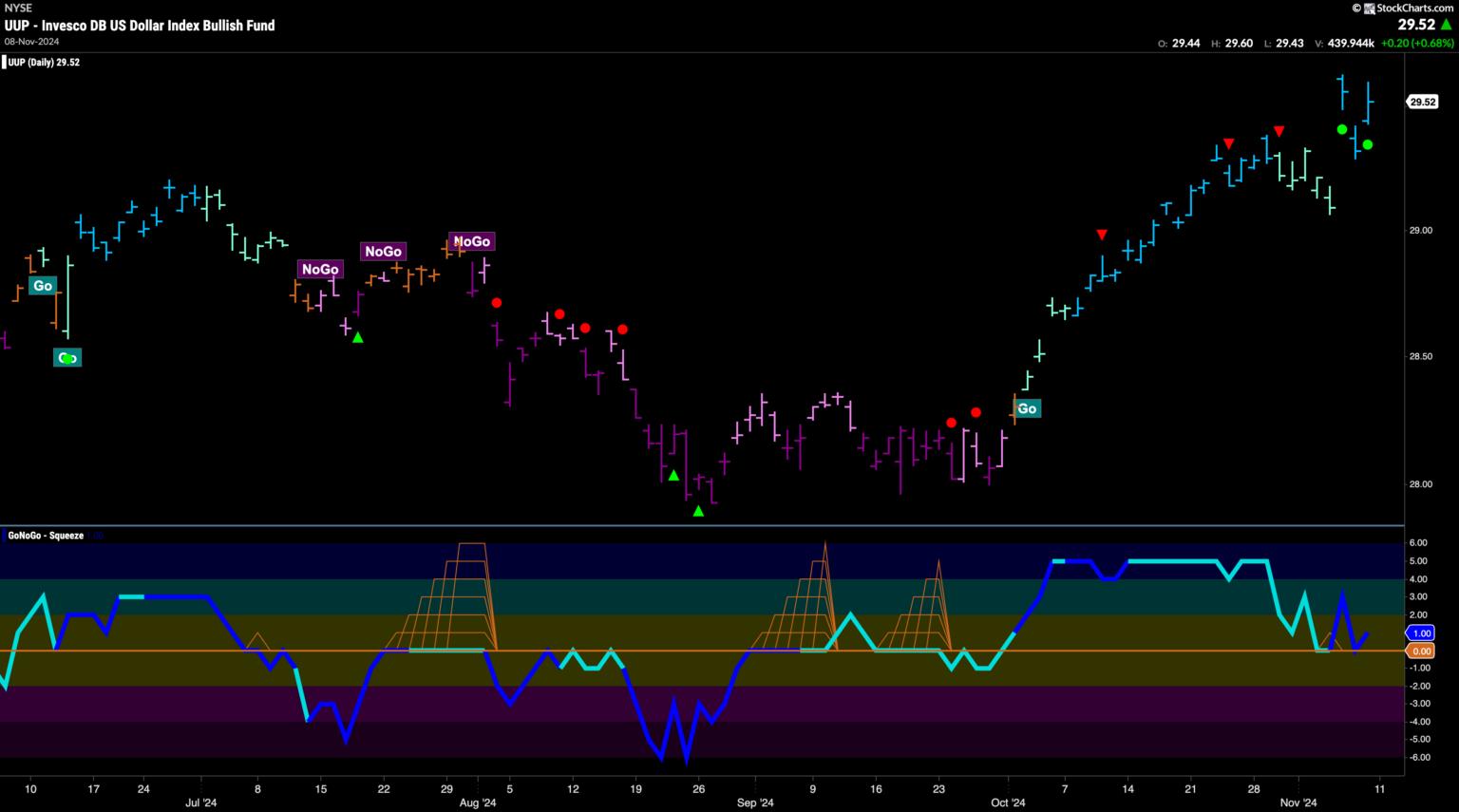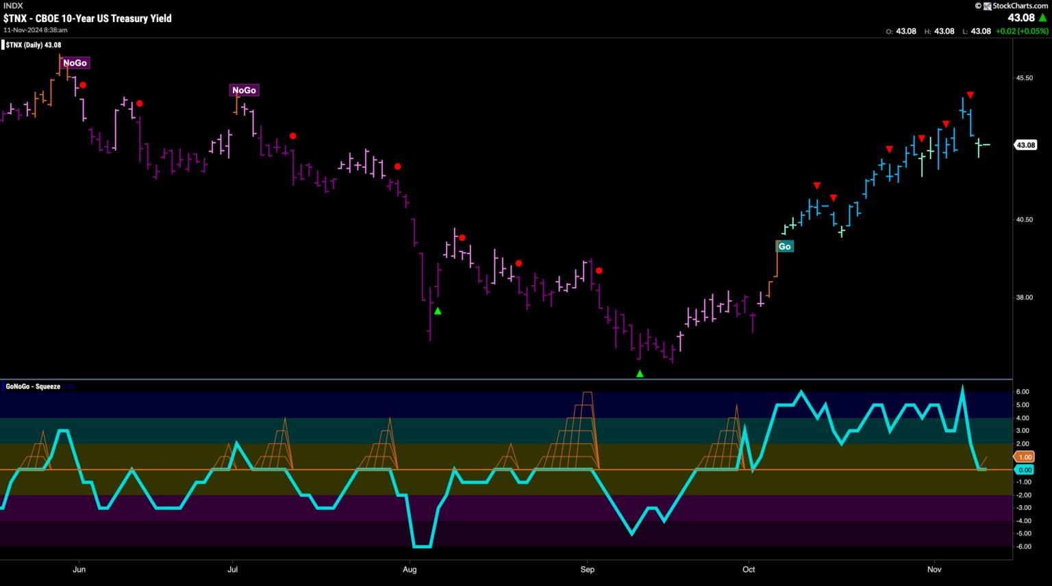 Treasury bond yields saw the “Go” trend continue this week but we saw a little weakness creep in with GoNoGo Trend painting an aqua bar. This comes after we saw a Go Countertrend Correction Icon (red arrow) indicating that price may struggle to go higher in the short term. We will watch to see if price finds support here and sets a new higher low. GoNoGo Oscillator has fallen to test the zero line from above and we know that if the “Go” trend is to remain healthy it should find support at that level. If it can rally back into positive territory then we will know that momentum is resurgent in the direction of the underlying “Go” trend.