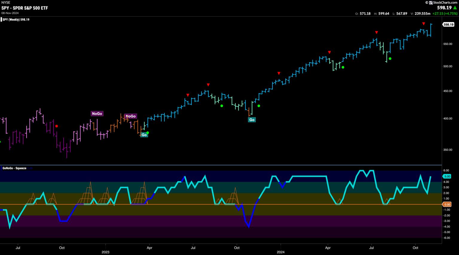 The GoNoGo chart below shows that after some weakness that saw price fall from the last Go Countertrend Correction Icon (red arrow), price gapped higher on Wednesday and prices soared to new highs in the aftermath of the election. GoNoGo Oscillator was able to recover positive territory after having fallen into negative territory the week before. Now, with the oscillator in positive territory at a value 4 on heavy volume, we know that momentum is on the side of the “Go” trend once again.