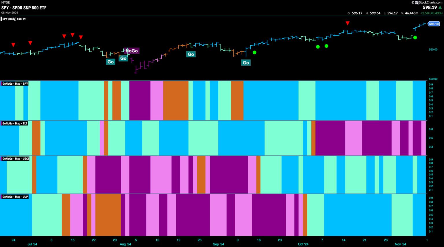 Good morning and welcome to this week’s Flight Path. Equities saw the “Go” trend continued this week and price gapped higher after some weaker aqua bars. We now see GoNoGo Trend painting strong blue bars at new highs. Treasury bond prices remained in a “NoGo” trend but the week ended with a weaker pink bar. The U.S. commodities index saw a strong end to the week as bright blue “Go” bars returned and the dollar likewise saw strength with strong blue “Go” bars the second half of the week.